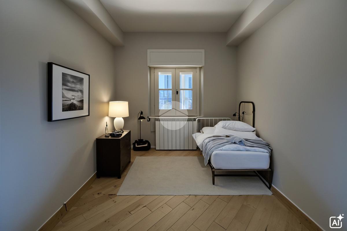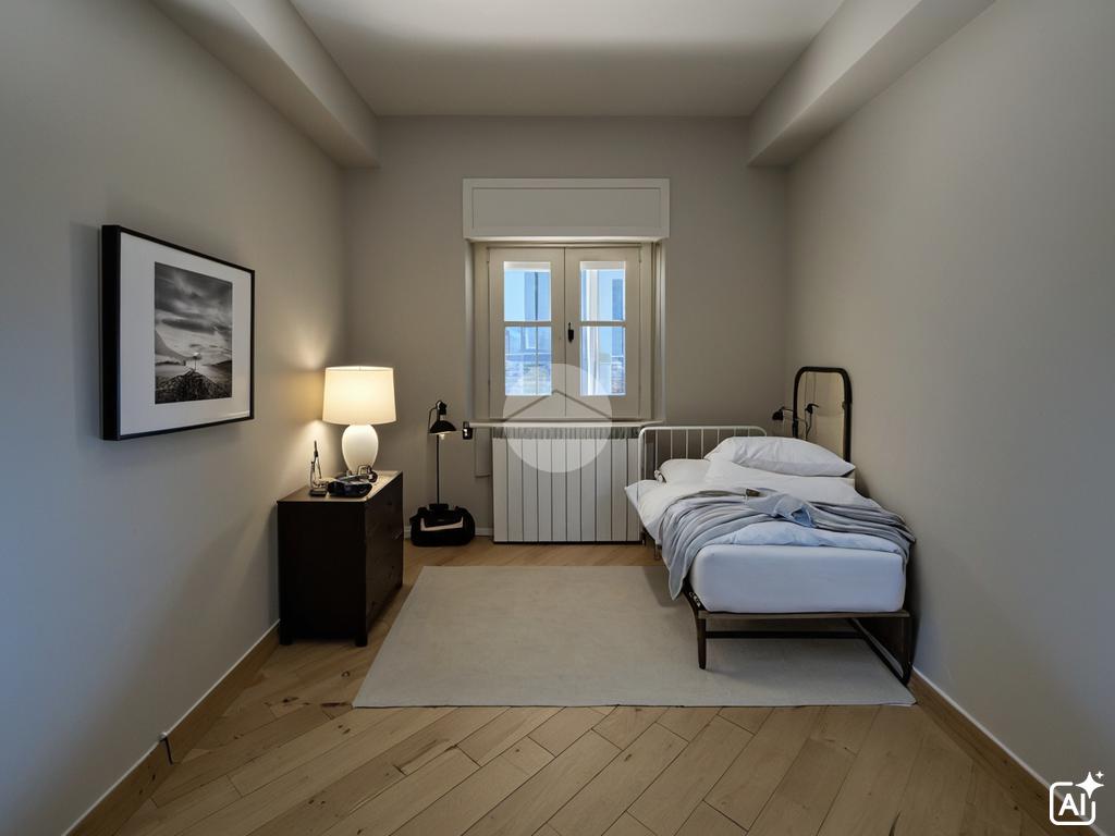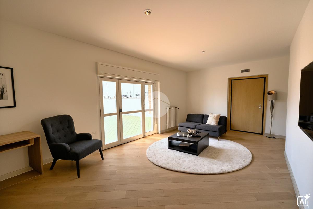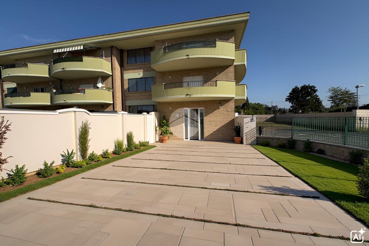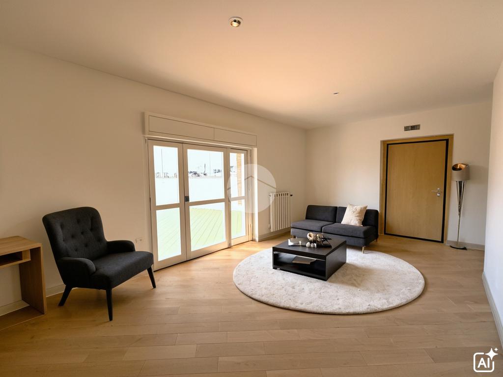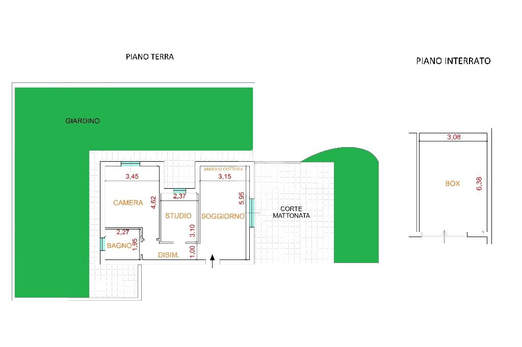 Appartamento piano terra di 55 mq composto da soggiorno con angolo cottura, disimpegno camera, studio e bagno. Box auto di 19 mq al piano seminterrato. Veranda di 77 mq e Giardino di 315 mq.