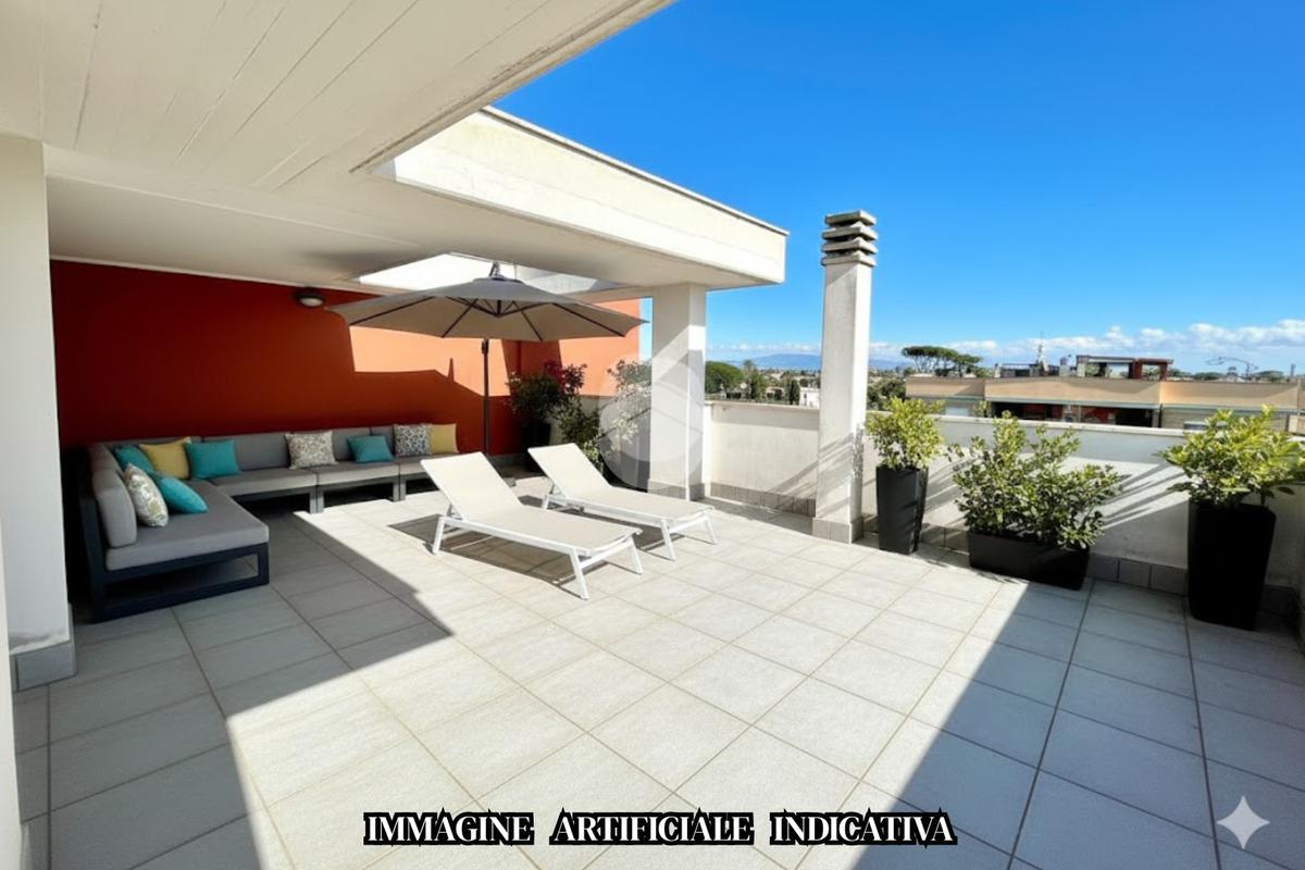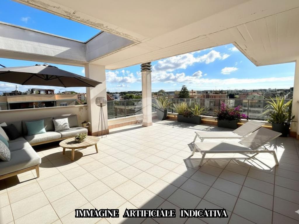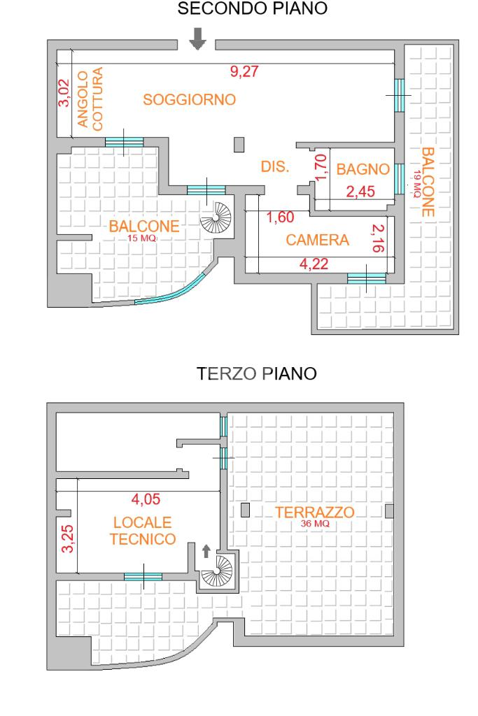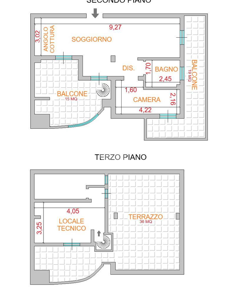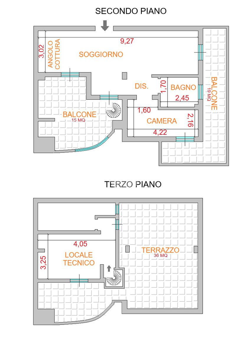 Appartamento al piano secondo e terzo di 70 mq composto da soggiorno con angolo cottura, disimpegno, camera e bagno. Terrazzo al Piano terzo di 40 mq con locale tecnico. Due balconi di 9 mq,15 mq e doppio posto auto recintato.