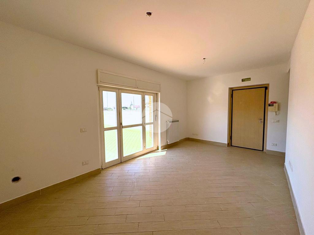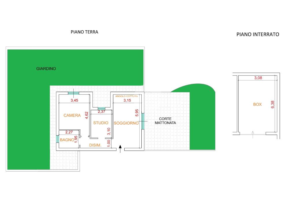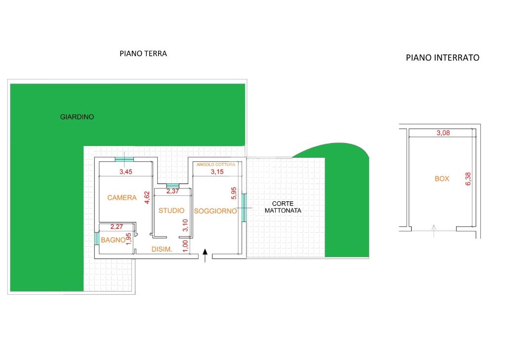 Appartamento Green piano terra di 55 mq composto da soggiorno con angolo cottura, disimpegno camera, studio e bagno. Box auto di 19 mq al piano seminterrato. Veranda di 77 mq e Giardino di 315 mq.