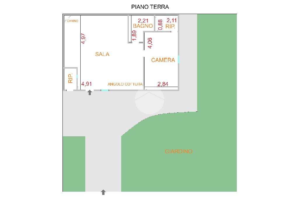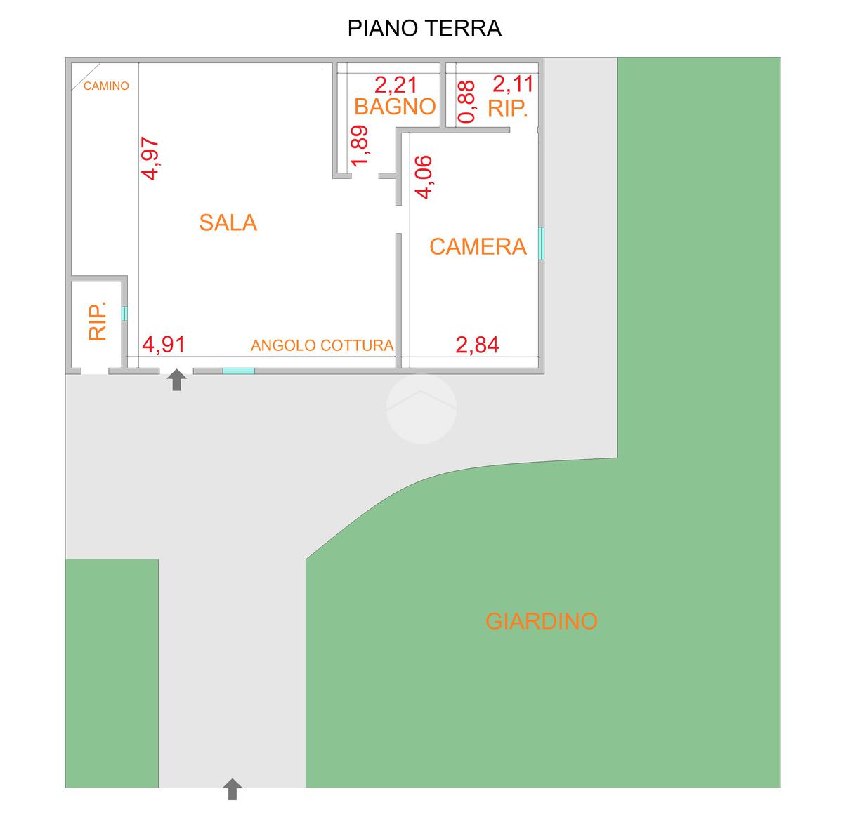 Casa indipendente di 50 mq. Unico livello composto da: sala con camino e angolo cottura, bagno e camera con cabina armadio. Corte mattonata di 60 mq e giardino di 700 mq.