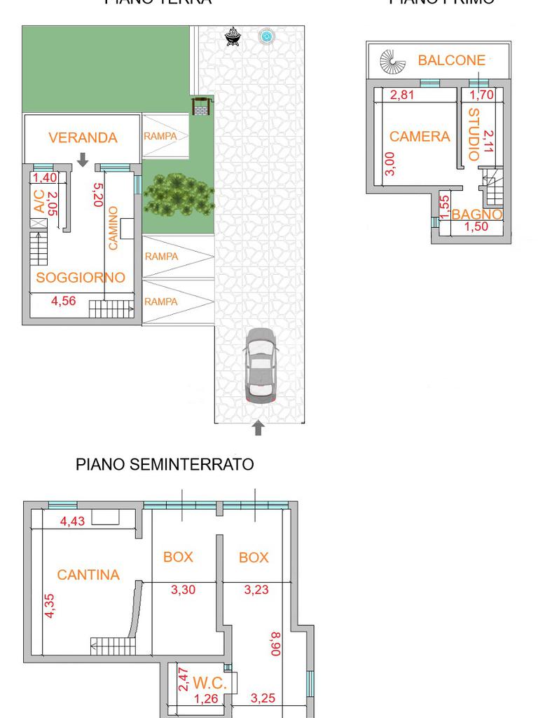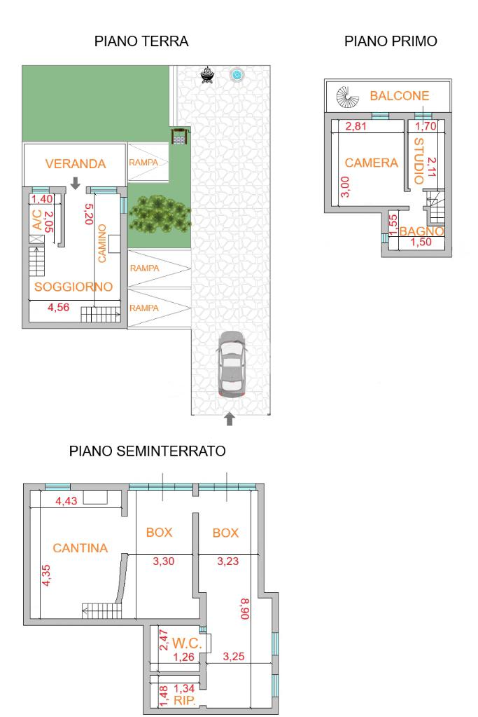 Porzione angolare di 90 mq su due livelli. Piano terra composto da: soggiorno con camino e cucina. Piano primo composto da: camera, studio e bagno. Piano seminterrato composto da: Cantina di 20 mq, bagno, ripostiglio e 2 Garage di 14 mq e 30 mq. Veranda di 14 mq, lastrico solare di 23 mq, balcone di 7 mq, giardino e corte mattonata di 220 mq.