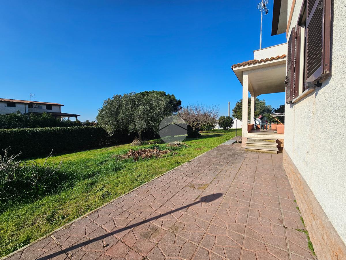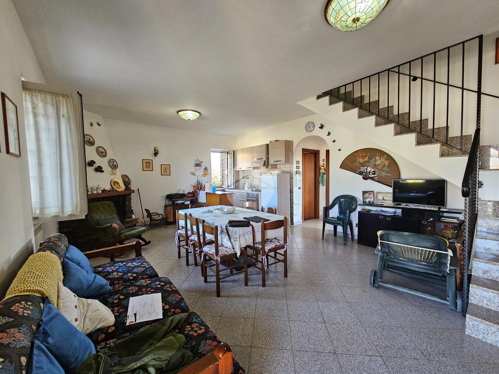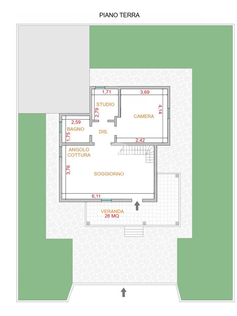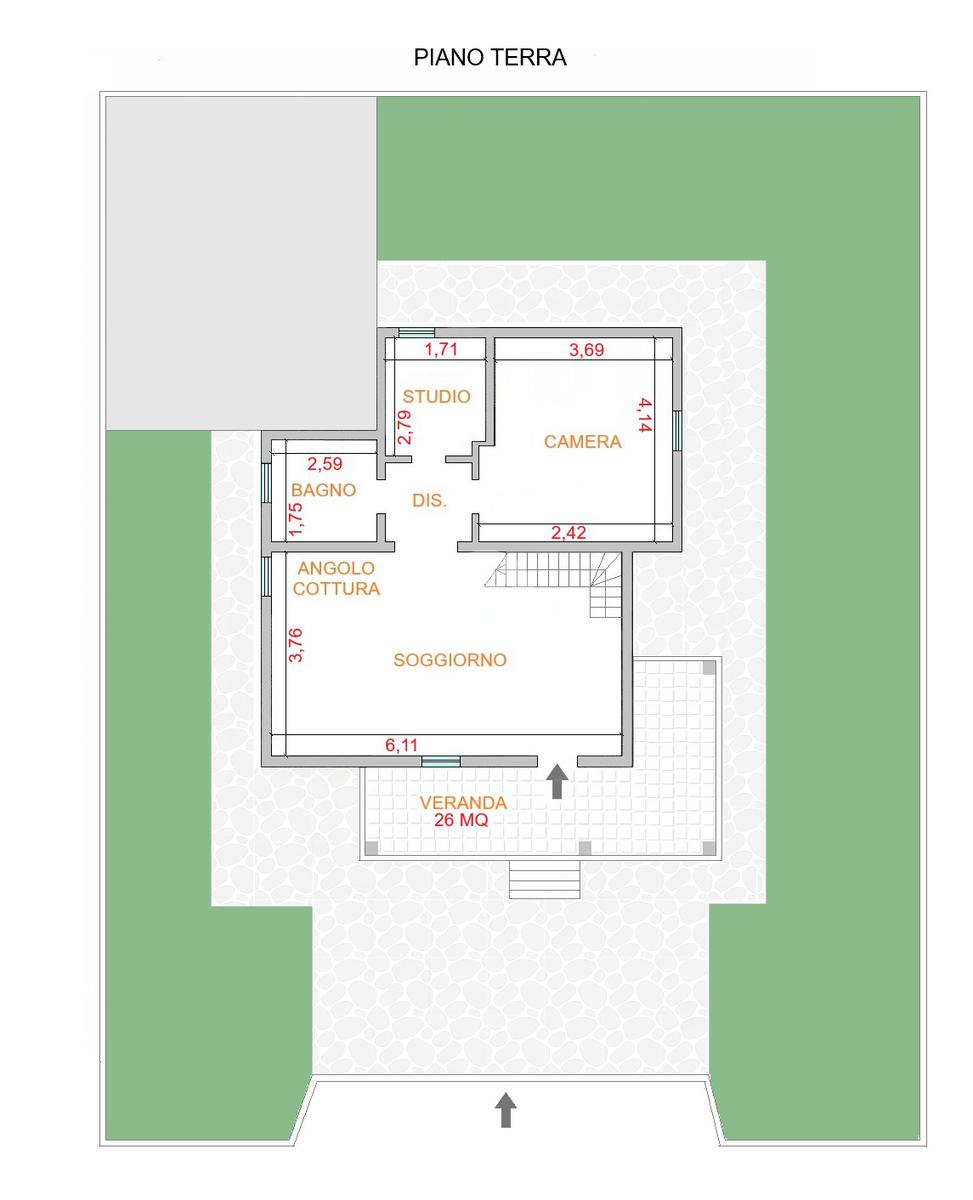 Piano terra di 70 mq composto da: soggiorno con angolo cottura, disimpegno, camera, studio e bagno; Piano primo di 70 mq composto da: 3 camere, studio e bagno. Veranda di 26 mq, balcone di 20 mq e giardino di 800 mq.