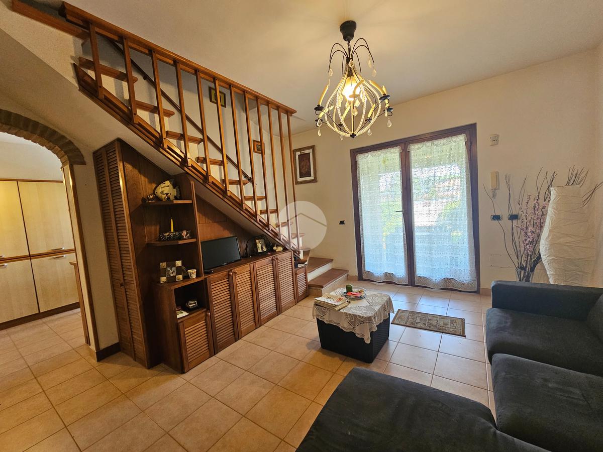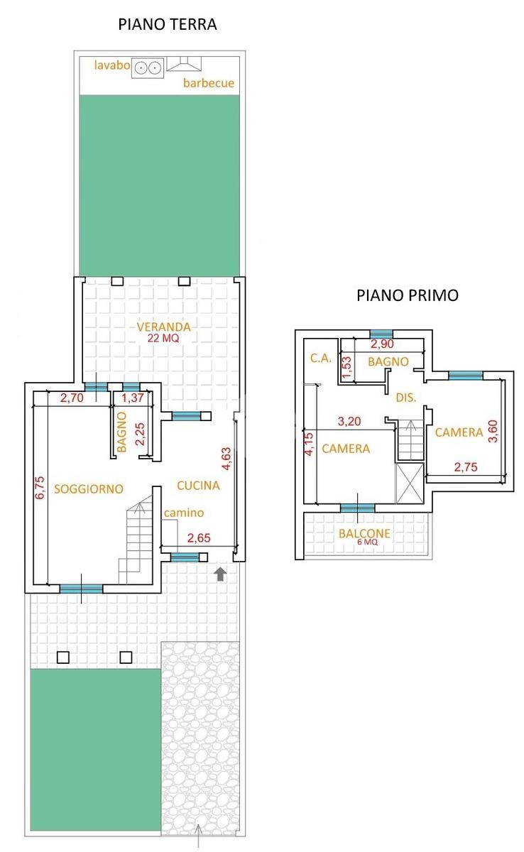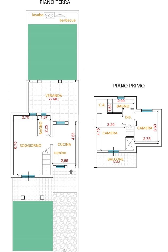 Villa a schiera di 90 mq su due livelli. Piano terra di 50 mq composto da cucina con camino, soggiorno e bagno. Piano primo di 40 mq composto da 2 camere, disimpegno e bagno. Veranda di 22 mq, Balcone di 6 mq e Giardino di 100 mq