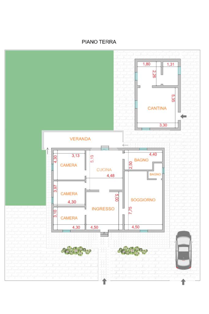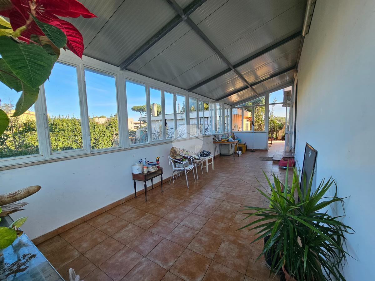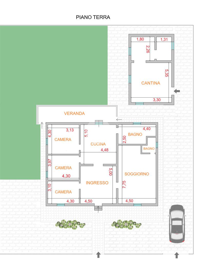 Composta da: ingresso, soggiorno, cucina, 3 camere e 2 bagni. Veranda di 27 mq e depandance di 27 mq suddivisa in unico vano cantina, disimpegno e lavatoio. Corte mattonata e giardino di 740 mq.