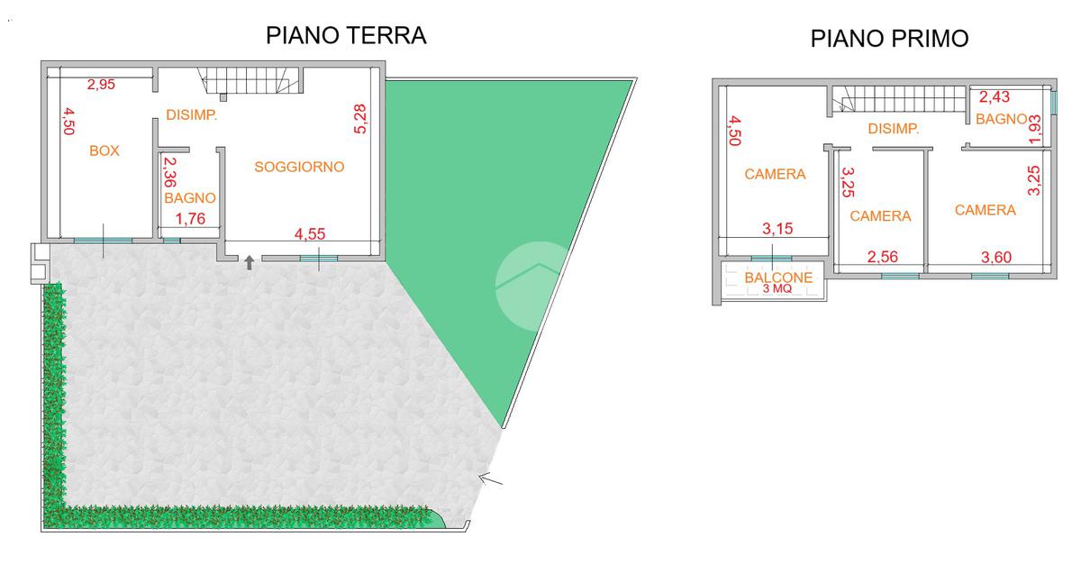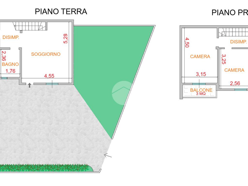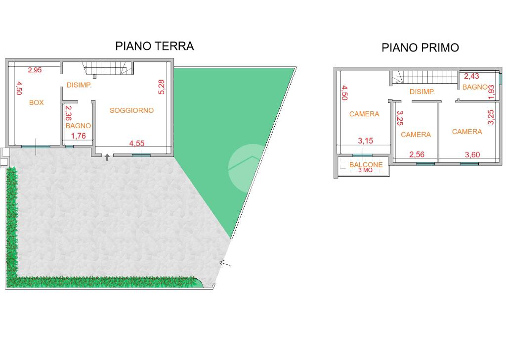 Villa Quadrifamiliare Green di 85 mq su due livelli. Piano terra composto da: soggiorno con angolo cottura e bagno. Piano primo composto da: 3 camere, disimpegno e bagno. Garage a piano terra di 15 mq, balcone di 3 mq e giardino di 125 mq.