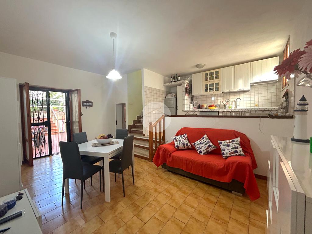 Appartamento in villa di 105 mq su due livelli. Piano terra composto da soggiorno con angolo cottura, magazzino di 35 mq con bagno. Piano terra rialzato composto da due camere, disimpegno e bagno. Veranda di 24 mq, Terrazzo di 11 mq e corte mattonata di 50 mq.